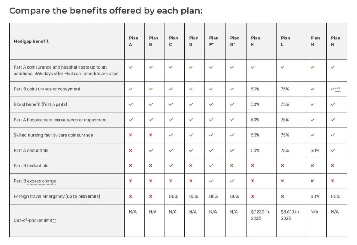 The chart below shows basic information about the different benefits that Medigap plans cover. If a percentage appears, the Medigap plan covers that percentage of the benefit, and you are responsible for the rest.